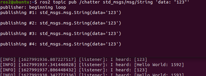 ros2 topic pub /chatter std_msgs/msg/String 'data: "123"'